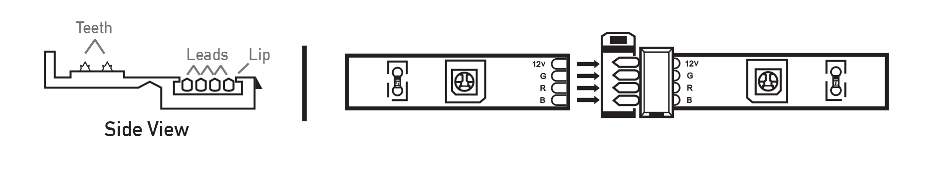 - Clamp the connector lid once the LED strip is in place. The teeth on the lid will secure the LED strip. Be sure that both strips are aligned properly before securing connector.